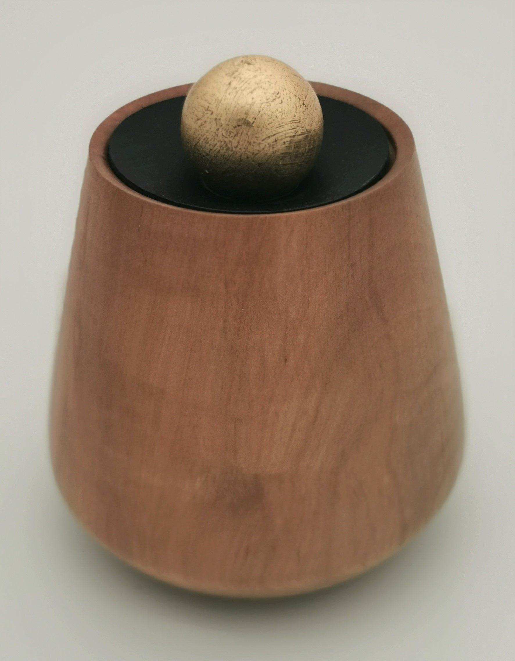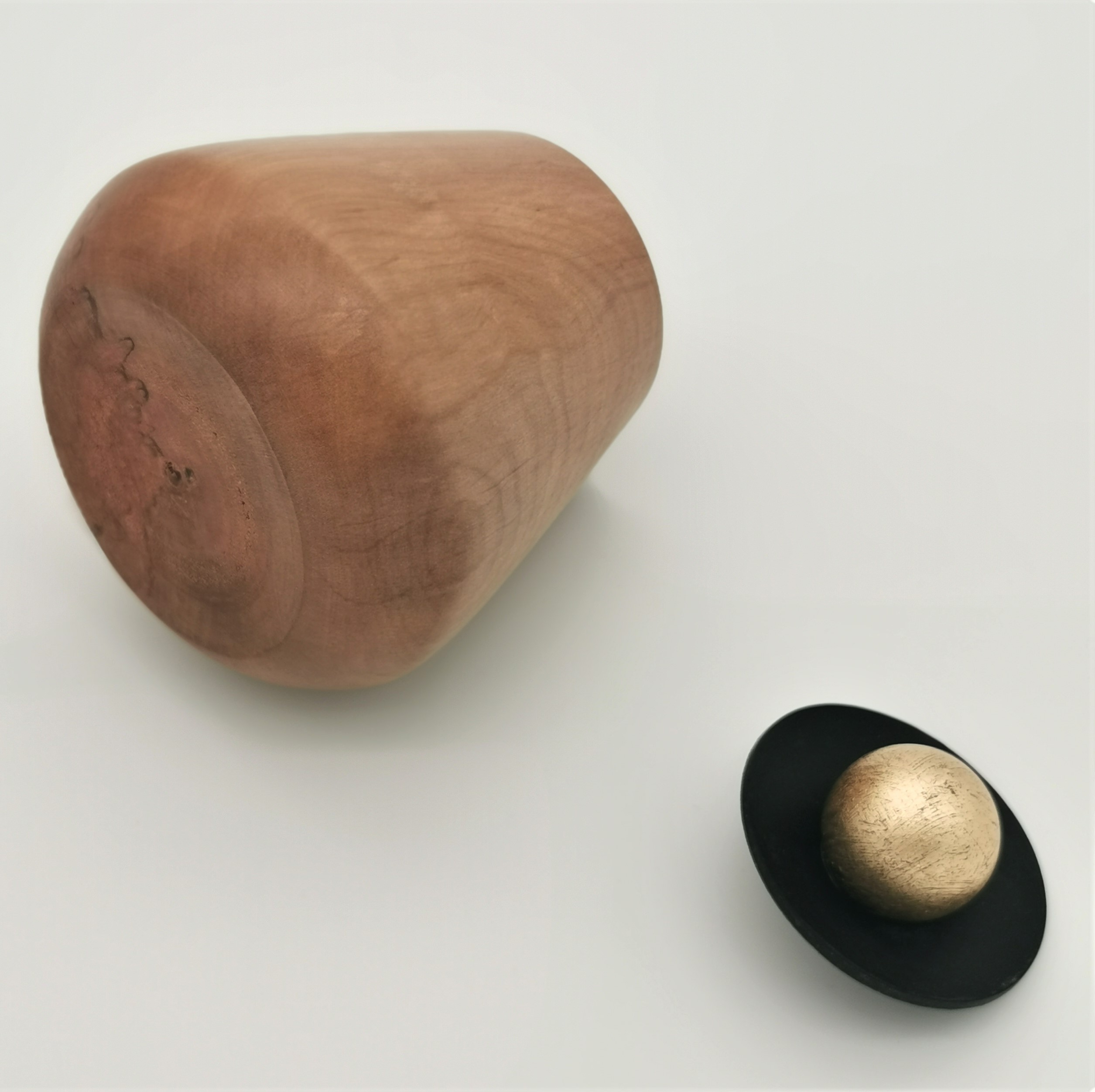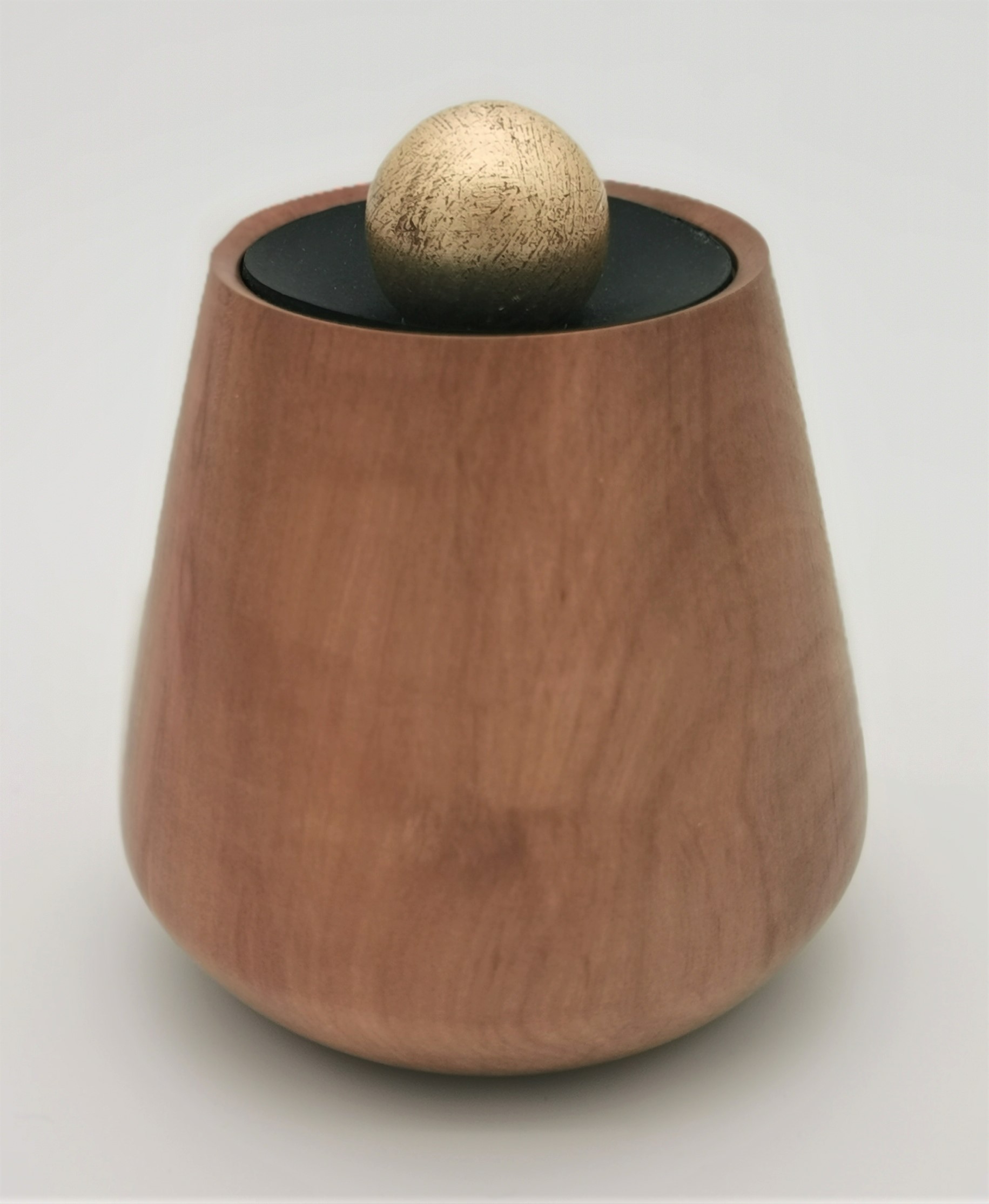Die Dose aus Kirschholz besticht durch ihren Lederdeckel und den güldenen Griff, die im Kontrast zur feinen Maserung des Holzes stehen. Die ungefähren Maße betragen 110 mm im Durchmesser und 80 mm in der Höhe. Das Holz stammt aus Europa und hat eine rotbraune Färbung mit einer feinen, matt glänzenden Oberfläche.
