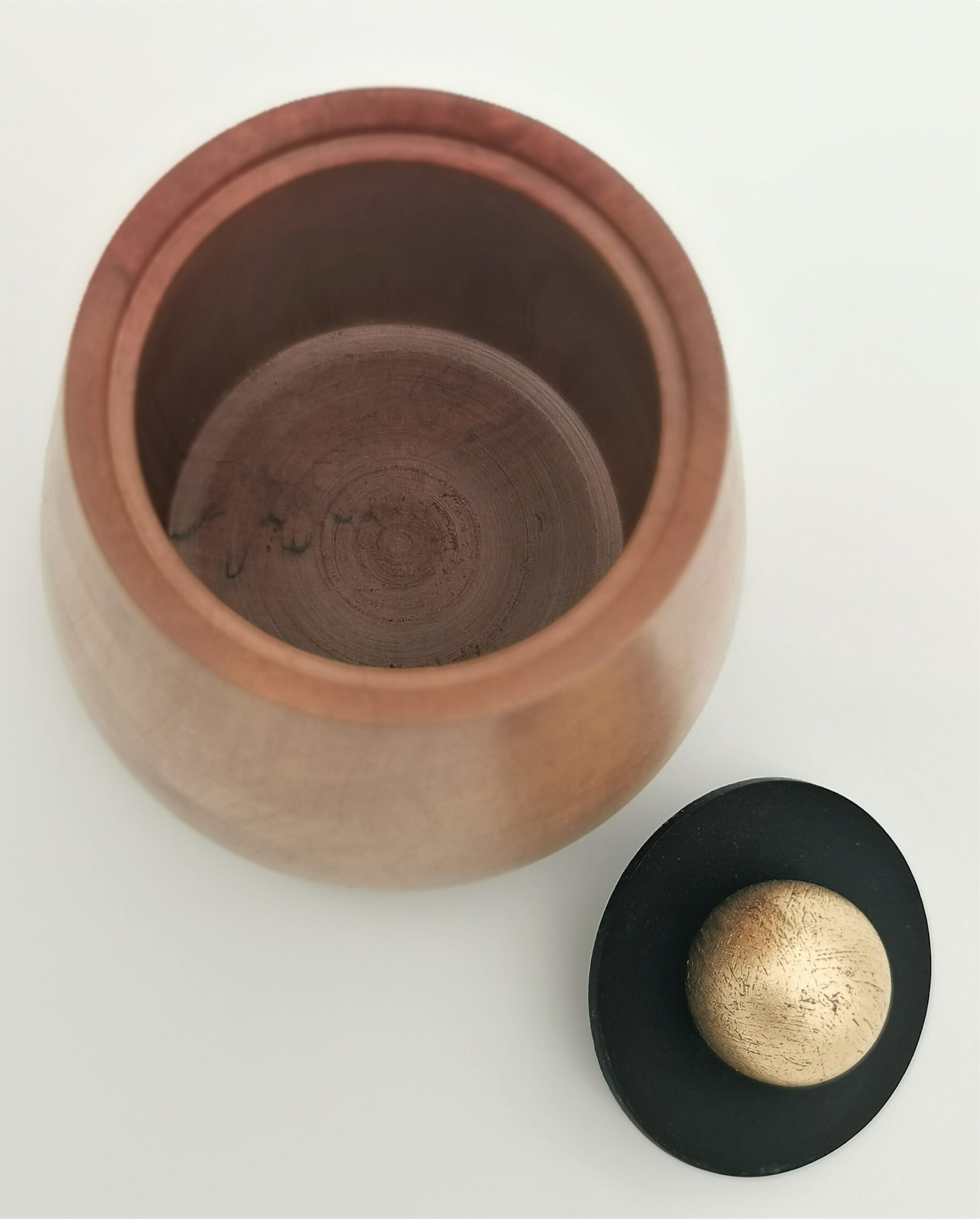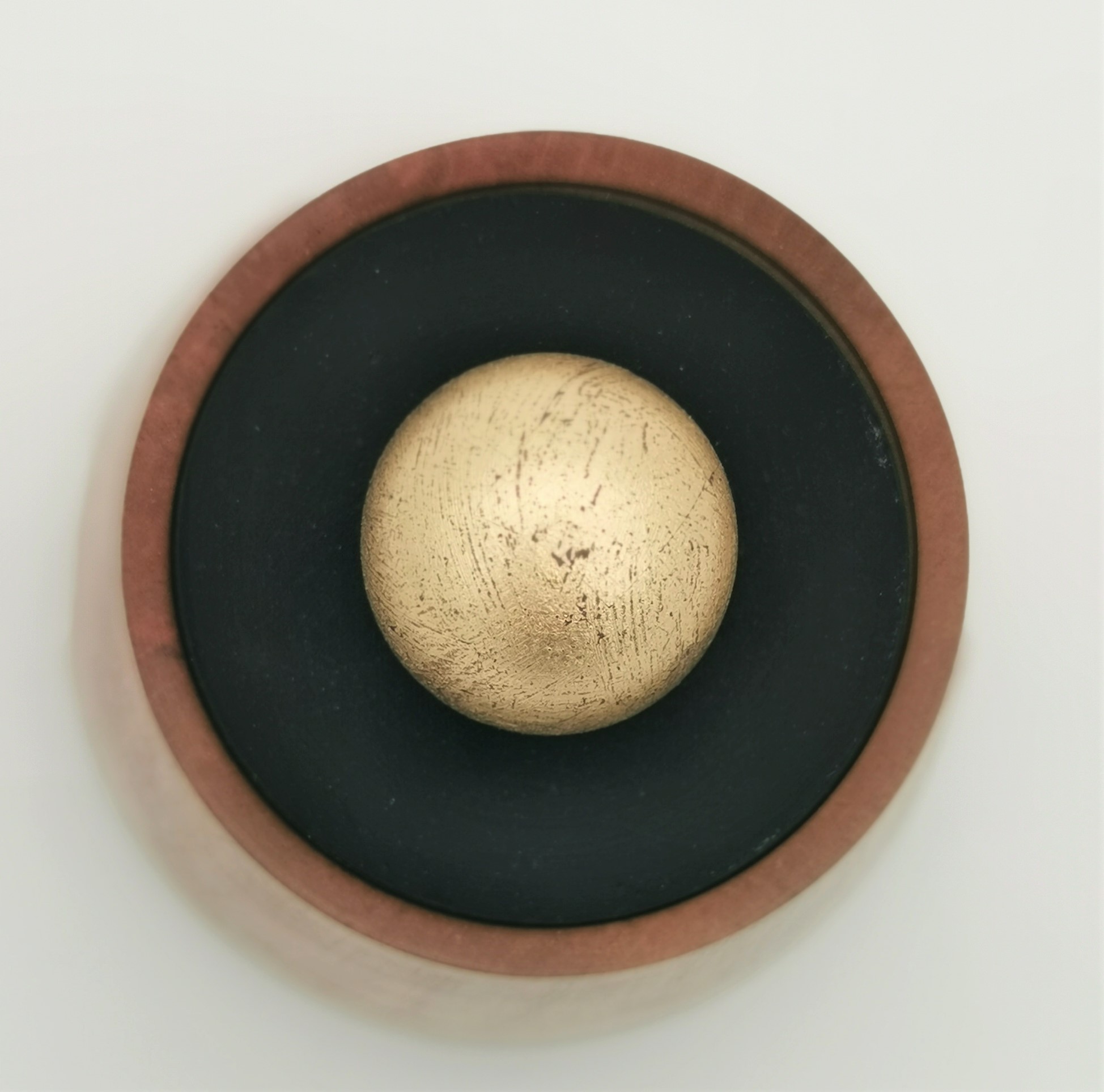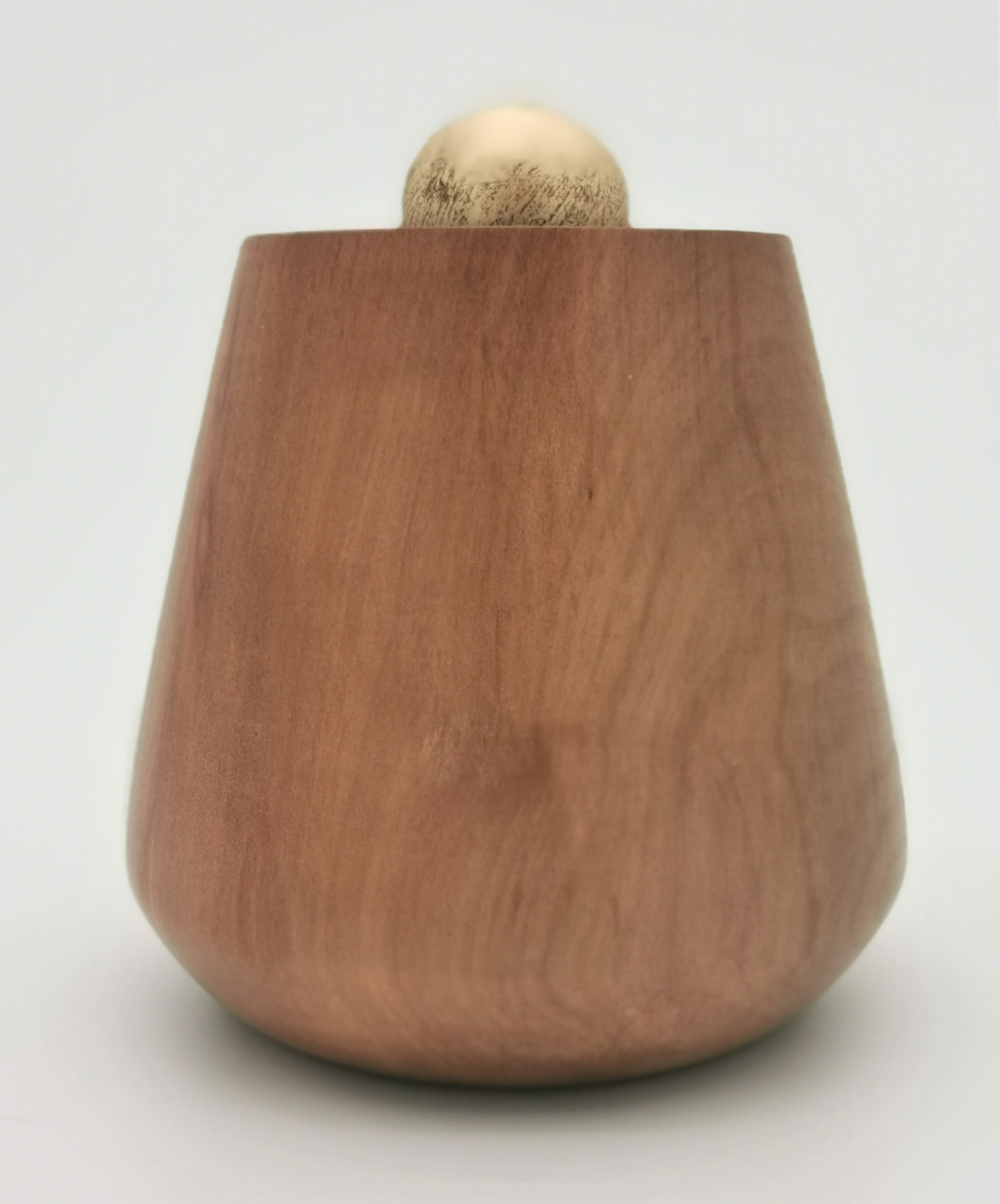 Die Dose aus Kirschholz besticht durch ihren Lederdeckel und den güldenen Griff, die im Kontrast zur feinen Maserung des Holzes stehen. Die ungefähren Maße betragen 110 mm im Durchmesser und 80 mm in der Höhe. Das Holz stammt aus Europa und hat eine rotbraune Färbung mit einer feinen, matt glänzenden Oberfläche.